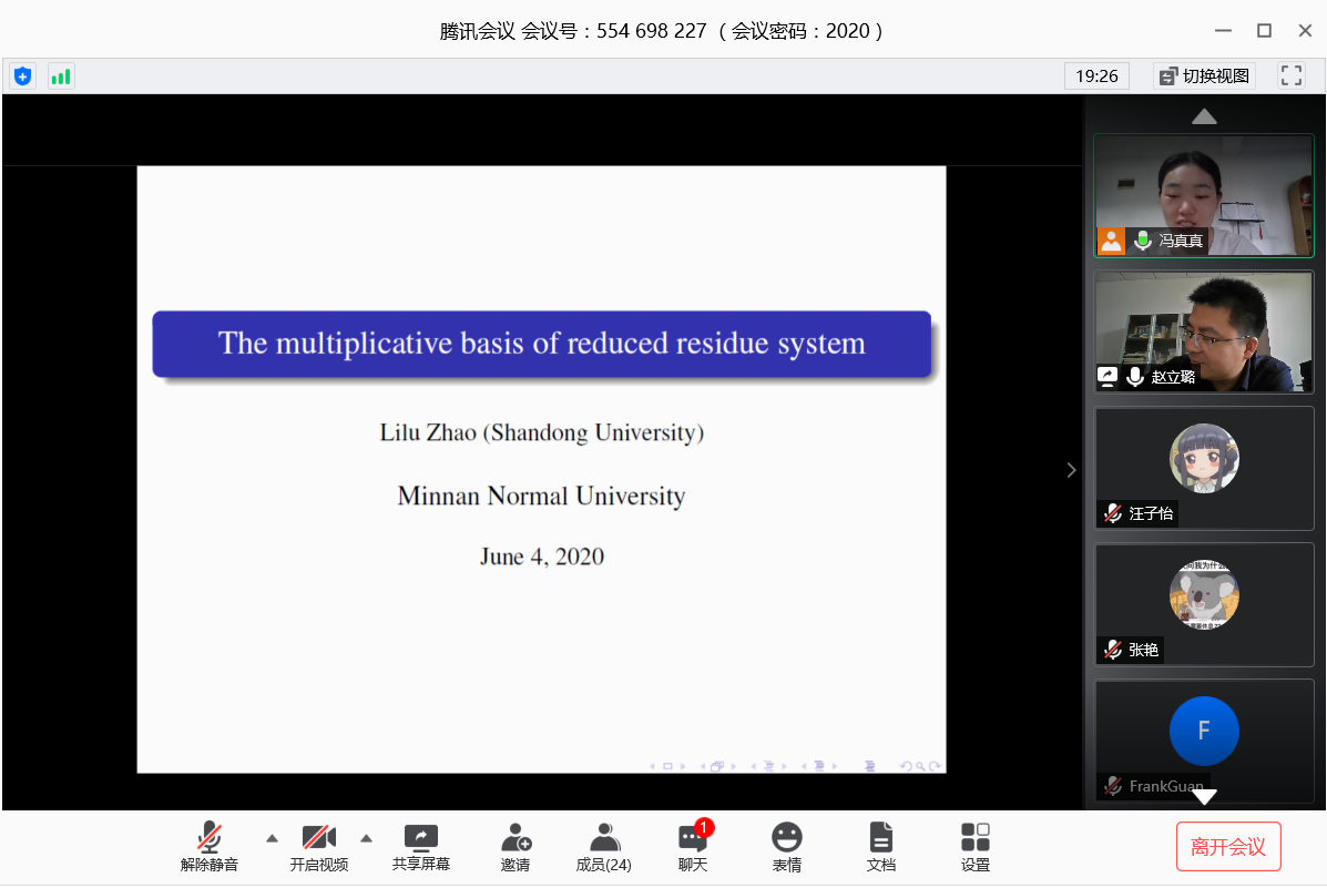 应我院邀请,6月4日上午,山东大学的赵立璐教授在腾讯会议作了《The multiplicative basis of reduced residue system》的报告。相关师生聆听了此次报告,报告由冯真真老师主持。