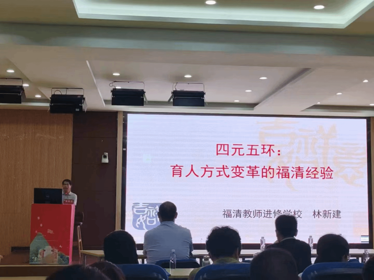 福清市教师进修学校林新建教授作题为《四元五环:育人变革的福清经验》的讲座。林新建教授结合多年教育经验提出强调以学生为中心,注重核心素养的培养,特别是理性思维、数学抽象、逻辑推理等能力。通过“四元五环”的教学模式,鼓励学生自主探究,从感知背景到抽象特征,再到体悟要义,最终达到深化理解和内化知识的目的。这种方法旨在激发学生的好奇心与求知欲,让他们在体验与思考中锻炼出关键能力和核心素养,从而实现个人成长与发展。