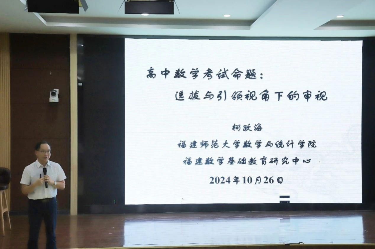 福建师范大学柯跃海教授作题为《高中数学考试:选拔视角下的命题于评价》的讲座。柯跃海教授从高考数学考试命题是否遵循命题依据、是否有效引导教学、是否科学合理准确以及是否合乎命题规范四个视角来阐述高考数学试题选拔视角下的命题与评价,并列举了许多例题进行讲解,让一线教师和学生们受益匪浅。