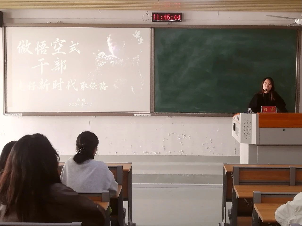 郑珊老师以《黑神话悟空》游戏为背景,借“我命由我不由天”“只要见性志诚,念念回首处,即是灵山”等悟空语录,呼吁新时代的青年学生干部争做“悟空式”干部,学会感恩,坚定理想信念,不断提升攻坚克难本领,觅得学生工作的“真经”!