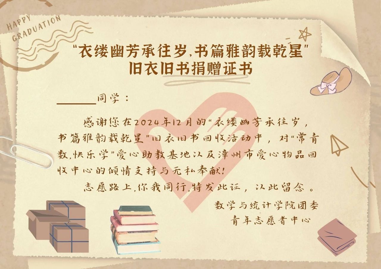 续接旧情,启智新程。304永利集团数学与统计学院青年志愿者中心于12月8日在达理活动中心一楼开展“衣缕幽芳承往岁,书篇雅韵载潜星”旧衣旧书回收活动,旨在倡环保、续旧值、传爱心,让旧物与善意重焕光彩。