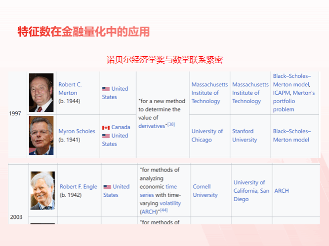 课程最后,结合本节课程知识点(矩、分位数、峰度和偏度),讲授特征数在金融量化中的应用案例,联系金融领域的风险管理工具(VaR模型)和诺贝尔经济学奖得主的 Black-Scholes 模型,说明概率论对现代金融的奠基性作用,鼓励学生追求跨学科融合的学术视野。