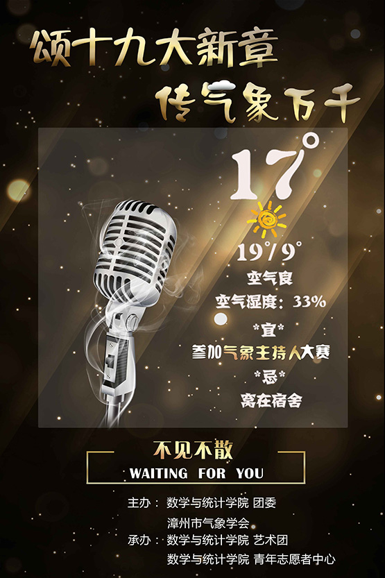 党的十九大是我们党在新时代开启新征程、续写新篇章的政治宣言和行动纲领,作为当代青年大学生要牢记使命,敢于追梦,努力圆梦。“少年强则国强”,为践行 “奉献、友爱、互助、进步”的志愿者精神,同时为加强校园气象科普建设,拓展气象科普服务方式,让更多的人了解气象知识,合理利用天气气候资源,掌握气象趋利避害科学方法,提升气象防灾减灾意识和技能。数学与统计学院团委携手漳州市气象学会,举办以“颂十九大新章,传万千气象”为主题的气象主持人大赛,以促进校局合作、校校合作,共同推进气象科普服务发展。以下是“颂十九大新章,传万千气象”气象主持人大赛的具体内容: