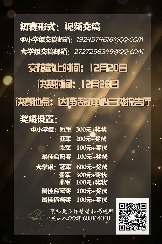 注:初赛选手需自行准备视频发送至邮箱:中小学组(文件命名:组别+姓名+联系方式)发至数统院青志官方邮箱:1924574616@qq.com;大学组(文件命名:组别+姓名+联系方式+院系)发至数统院艺术团官方邮箱:2727296349@qq.com。