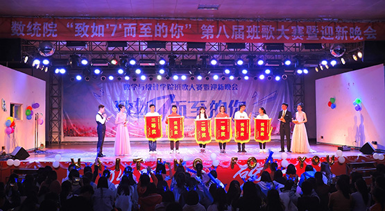 12月14日晚,“致如‘7’而至的你” 数学与统计学院第八届班歌大赛暨2017年迎新晚会在龙文馆成功举办。学校团委及机关部分教师、数统学院党政领导、学院部分教师、辅导员及数统学院学生参加晚会。在晚会开始前,道具组、场控组、礼仪组等早早地进入紧张地筹备当中,确保整场晚会的顺利进行。随着精湛的吉他solo、歌曲串烧《致青春》,班歌大赛暨迎新晚会正式拉开帷幕。
