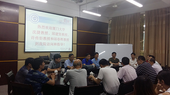 应我校数学与统计学院邀请,2017年7月31日美国数学会院士兼厦门大学高层次人才计划讲座教授沈捷教授、厦门大学闽江学者特聘教授邱建贤教授和许传炬教授、厦门大学数学科学学院副院长邱春晖教授到我校进行指导和交流。访问期间,四位教授与数学与统计学院的师生们就数学与统计学院的信息与计算科学专业建设、学科建设和科研项目申请等相关问题进行座谈,座谈会由林梦雷院长主持。四位教授从各个方面对相关的问题进行了解答,并提出了许多建设性意见。