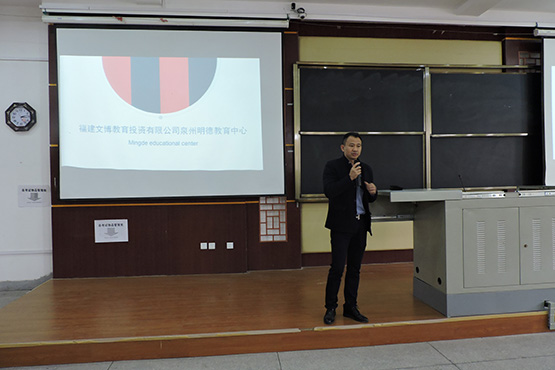 12月15日下午3:00,福建金帝集团旗下教育品牌福建泉州外国语中学、福建泉州明德教育中心专场宣讲会在砺志楼120顺利举行。泉州明德教育中心校长郭文峰、泉州外国语中学招师办公室主任杜增产作为主讲人出席本次宣讲会。数学与统计学院、物理与信息工程学院、化学与环境学院以及外国语学院部分13级学生积极参与。