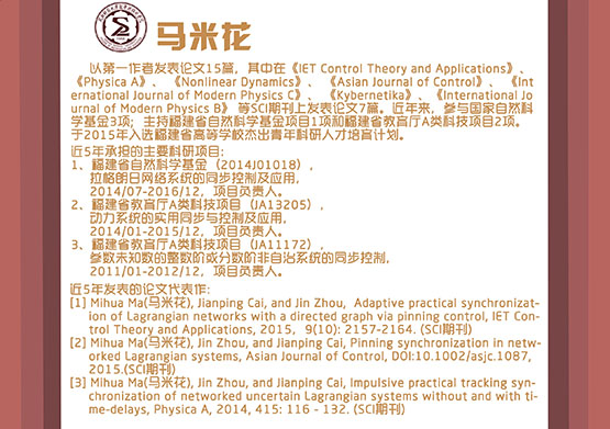 为庆祝“三八”妇女节,展现数学与统计学院女教师的风采,学院于本周收集了10名优秀女教师的个人事迹(附图,按姓氏拼音首字母排序),并以“三尺讲台,巾帼展风采”为主题,在学院网页和微信平台进行推送。这些女老师都具有副教授以上职称,或是具有博士学位,在科研、教学、育人等方面都有突出的贡献。