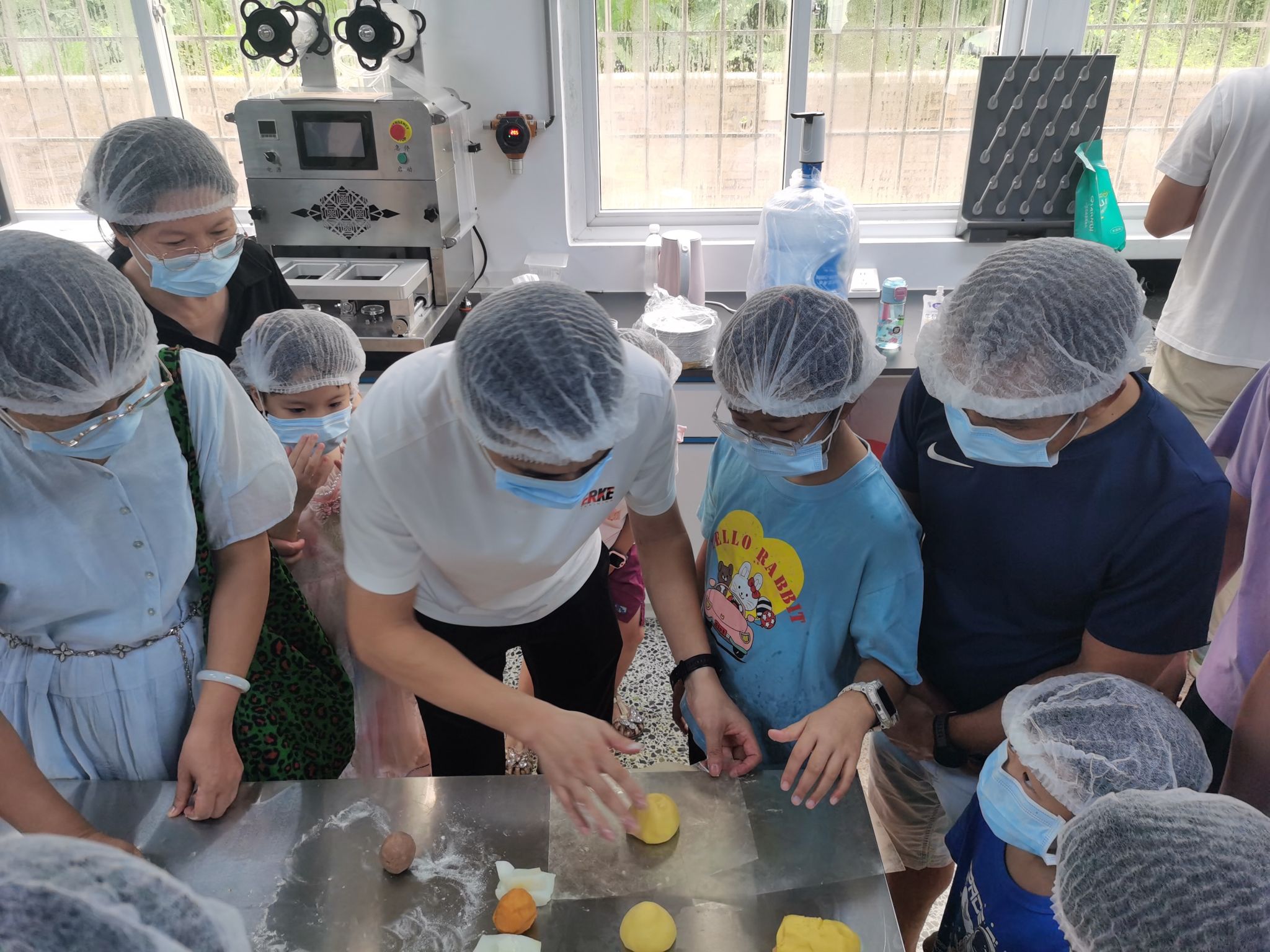 讲解结束后,大家带领着祖国的花朵们,开始分工合作,称材料、揉面团、分馅料、包饼皮、压膜成型。在专业老师的细心指导下,大家每个步骤都有条不紊,活动现场弥漫着轻松愉快的氛围。月饼制作好后,大家将其送入烤箱,等待着自己亲手制作的月饼新鲜出炉。