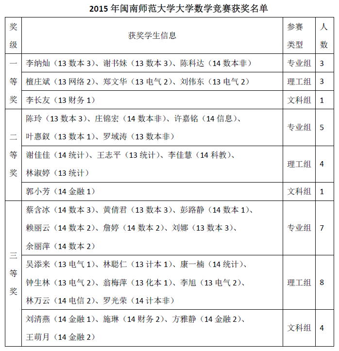 2015年304永利集团大学数学竞赛试卷评阅、评奖工作已于2015年12月17日结束。为严肃竞赛纪律,杜绝不当之风,竞赛组委会决定设立获奖结果争议期,为期7天(2015年12月18-24日)。现将获奖名单征求异议稿公布如下,公开征求广大师生的意见。