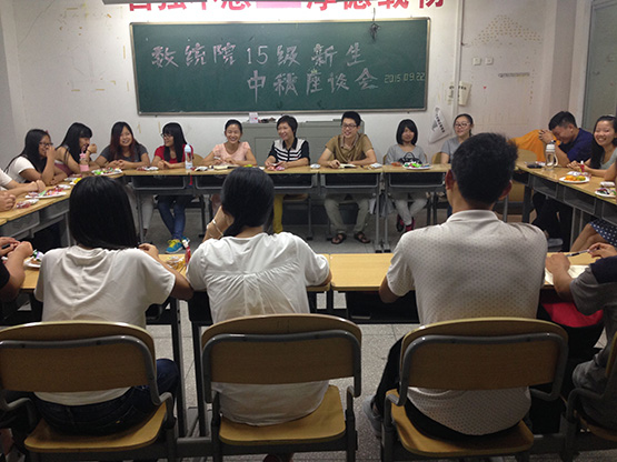 2015年9月22日晚7:30,我院在砺志楼101举办2015外省籍及少数民族新生代表中秋茶话会。院党委副书记陈晶莹老师、院团委副书记陈明老师、新生辅导员康碧芳老师与来自山东、山西、云南、广西等省以及土家、布依等少数名族学生代表24名新生欢聚一堂,共叙友情。