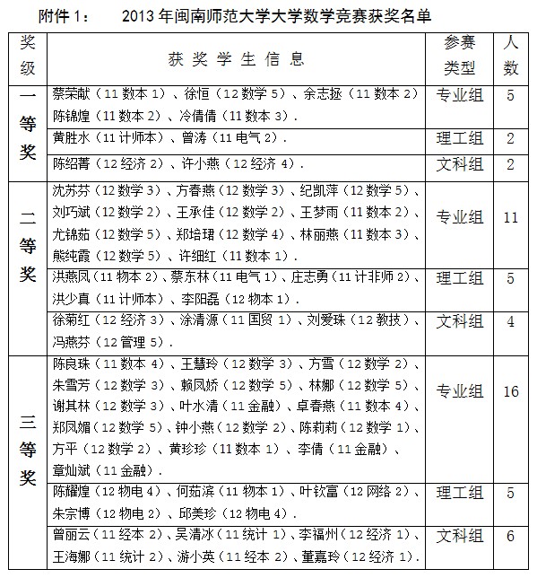 2013年304永利集团大学数学竞赛于2013年11月30日上午举行,经竞赛组委会组织专业教师评卷、专家组评审,对拟获奖的名单公示,最终确定本次竞赛一等奖获得者9名,二等奖获得者20名,三等奖获得者27名。另有6人分别获得2013年第五届全国大学生数学竞赛福建赛区竞赛二、三等奖。(获奖名单详见附件1、2)