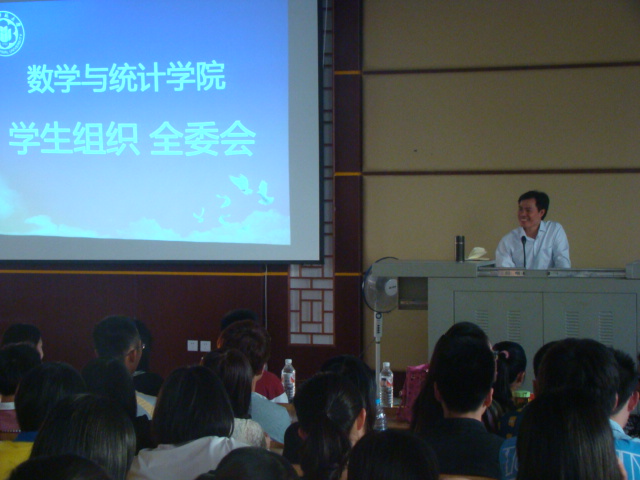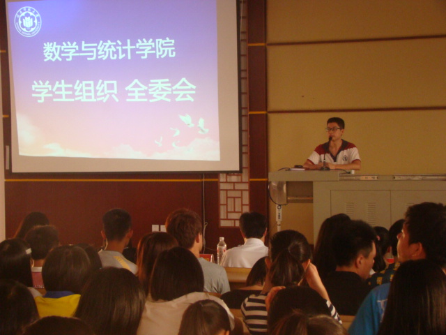 10月17日下午数学与统计学院在砺志楼120举行学生组织全委会。参加全委会的有学院党总支书记徐志怀教授、党总支秘书林晓老师、团委副书记陈明老师,以及五大组织A、B类干部及2013级全体干事。