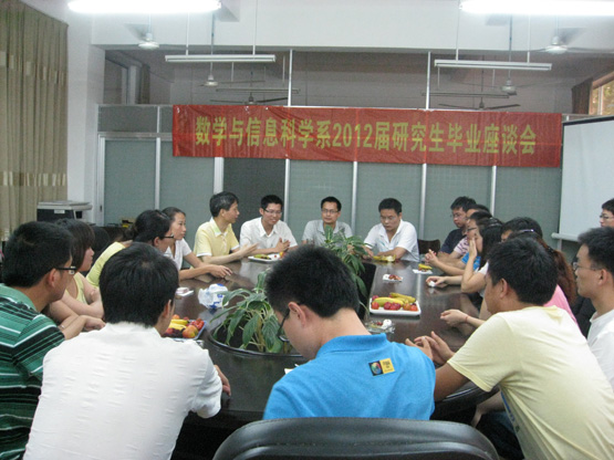 2012年6月14日下午, 我系在砺志楼114举行了2012届研究生毕业座谈会.我系党总支书记徐志怀教授, 主任李克典教授, 副主任蔡建平教授, 学生辅导员梁红梅老师和教学秘书林伟华老师出席了本次座谈会, 我系2012届毕业班研究生参加此次座谈会. 座谈会由副主任蔡建平教授主持.