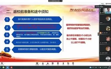 新学期扬帆起航,学院全体辅导员组织学生开展了线上“2022年秋季开学安全返校”主题班会,嘱咐学生们提高安全意识和加强自我防护,筑牢校园疫情防控基础,为学生科学、安全、有序地返校做好准备。会上,辅导员老师们再三叮嘱同学安全防疫的重要性,千万不能松懈,注意少聚集,出门佩戴口罩,勤洗手,多通风,返校途中加强防范。并对学生提出的问题积极回应,确保学生详细了解学校的各项通知要求。