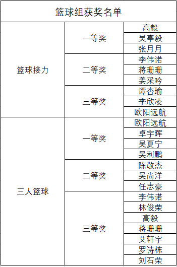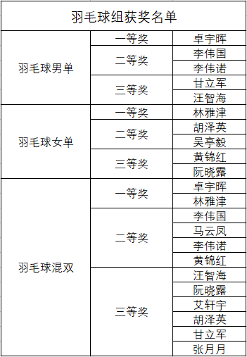 经过紧张激烈的角逐,各项目比赛成绩公布如下。