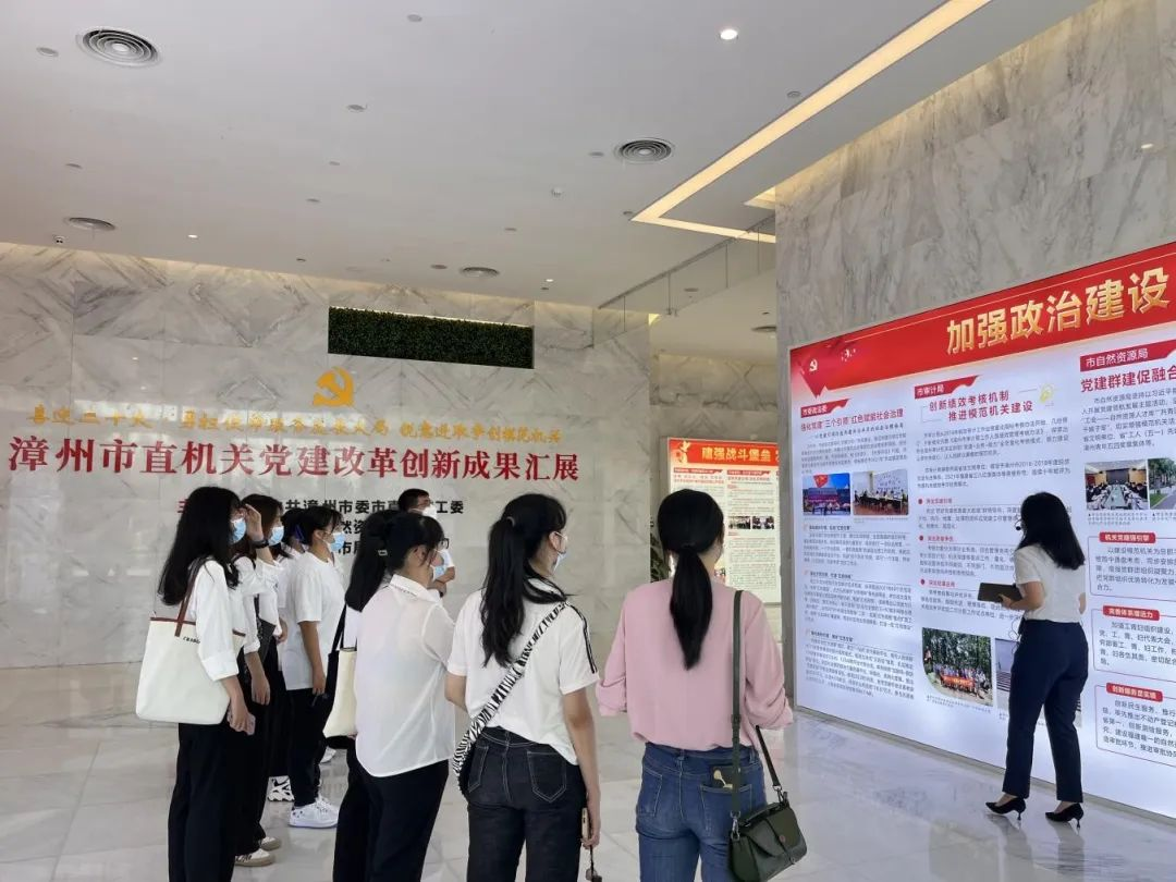 随后,同志们步入“喜迎二十大 • 勇担使命服务发展大局 锐意进取争创模范机关”漳州市直机关党建改革创新成果汇展展区,用心感受他们培育、总结、凝练出一大批立得住、叫得响、推得开的机关党建服务改革发展的特色品牌。激励党员们以“有心、有数、有责、有方”的状态,在生活、学习、工作中转变作风、奋发有为。