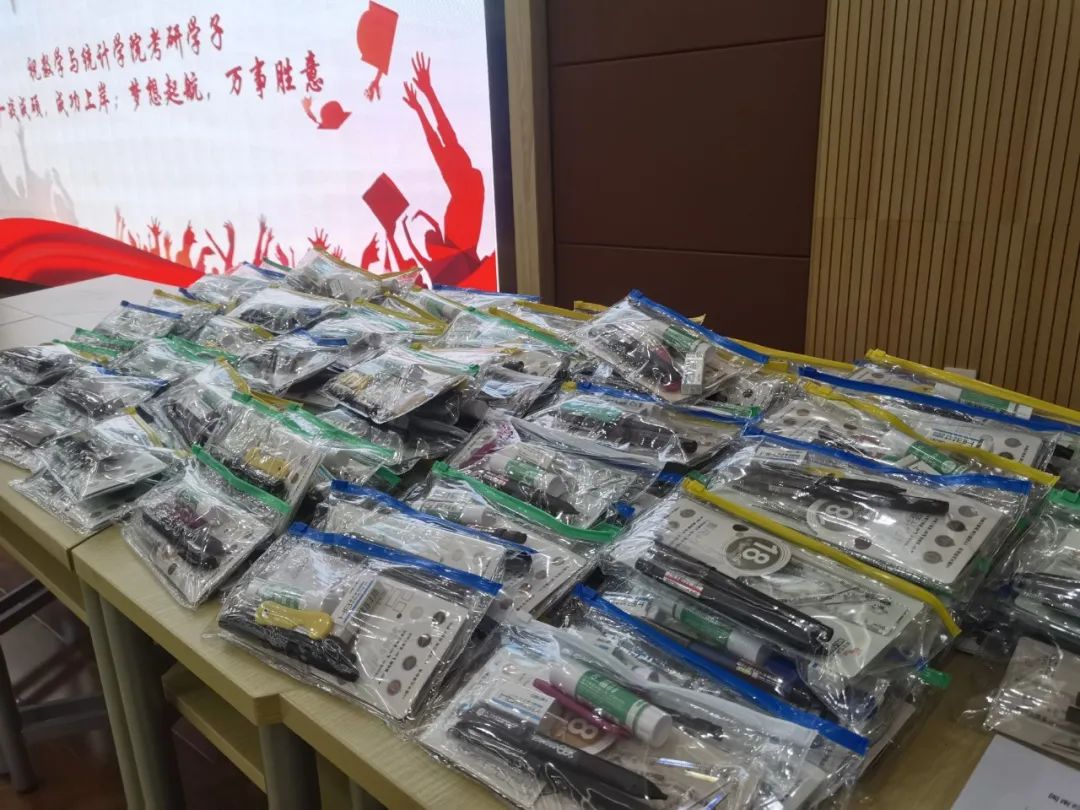 学院为233位19级考研学子准备了专属“考研加油包”,包含黑色中性笔、2B铅笔、橡皮、尺子、小刀和固体胶等考研必备物品。