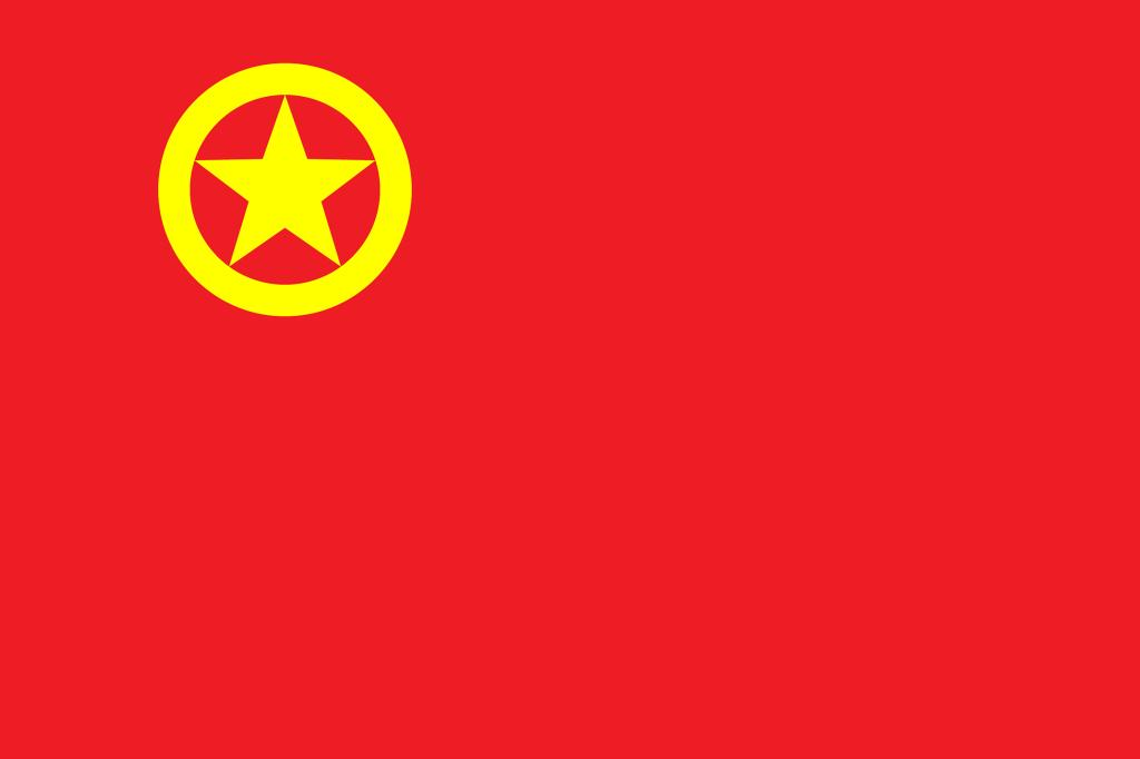 团旗的制作方法是黄圈围着的黄色五角星,缀在旗面左上方,制旗时,先将旗面对分为4个相等的长方形, 将左(它的反面为右)上角长方形上下分为12等份,再以左上角长方形中心点为圆心,3等份及4等份长为半径画两圆周,两圆周之间就是黄色圆圈。再在内圆周上定出5个等距离的点,其中一点位于圆周正上方。将此5点中各相隔的两点相联成直线,此5直线之外轮廓线就是黄色五角星的外缘。