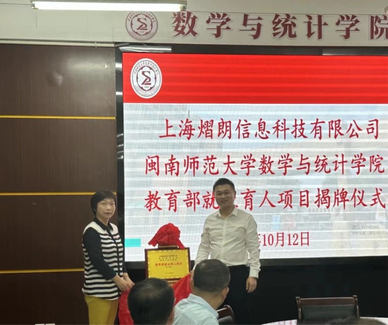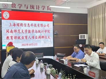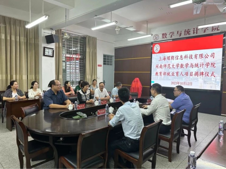 供需对接就业育人项目是教育部贯彻落实党中央、国务院“稳就业”“保就业”决策部署的举措之一,旨在深化高等教育改革,推动就业与培养有机联动、人才供需有效对接。304永利集团数学与统计学院与上海熠朗信息科技有限公司就业育人项目获教育部立项,10月12日学院于砺志楼114会议室携手举办了教育部就业育人项目揭牌仪式。上海熠朗信息科技有限公司总经理任隐夷、校招生就业处处长林贵东、数统学院党委书记陈晶莹、执行院长黄韩亮、党委副书记胡海智及学院教师代表、熠朗公司代表参加揭牌仪式,数学与统计学院执行院长黄韩亮主持。