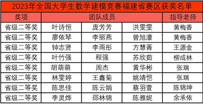 近日,2023年“高教社杯”全国大学生数学建模竞赛成绩揭晓,我校学子在数学建模竞赛中取得佳绩。此次比赛中,我校共有26支队伍获奖,其中全国二等奖2项,福建省一等奖5项,二等奖8项,三等奖11项。具体获奖情况如下所示: