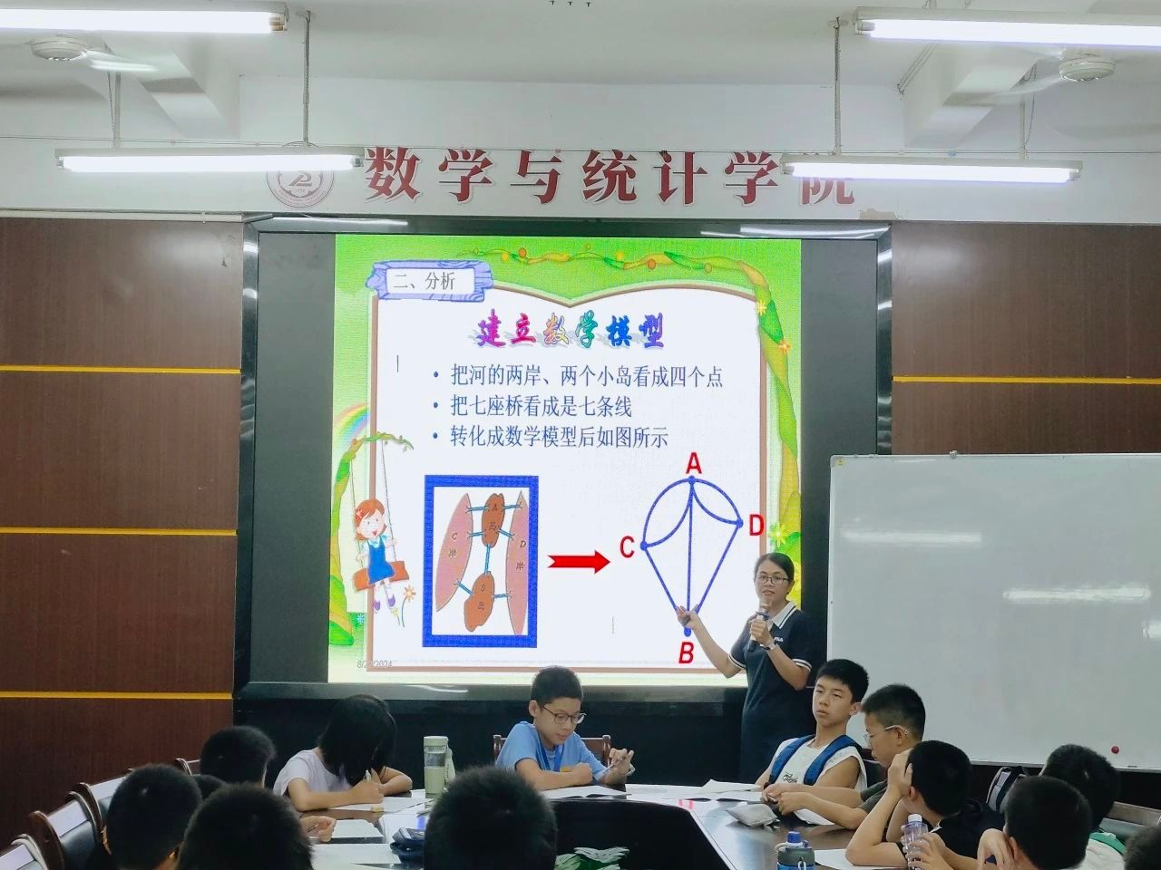 22日上午,由郑志景老师和胡黎莉老师讲解《趣味组合选讲》的知识点,从七桥问题与一笔画问题到点线图, 再到阶乘的拓展,最终引入排列组合的概念与应用,拓展同学们在统计与概率问题的解题思路与方法。