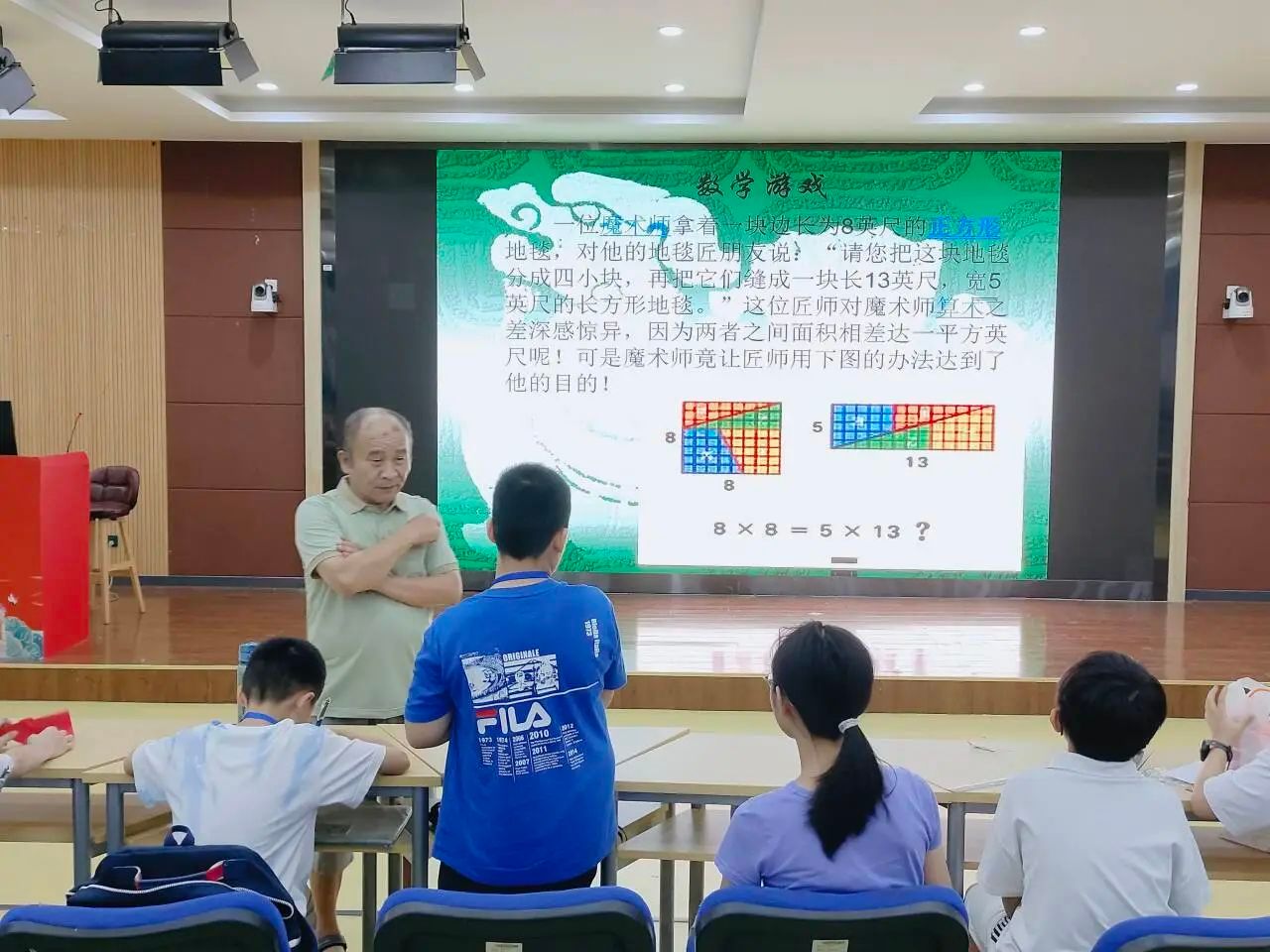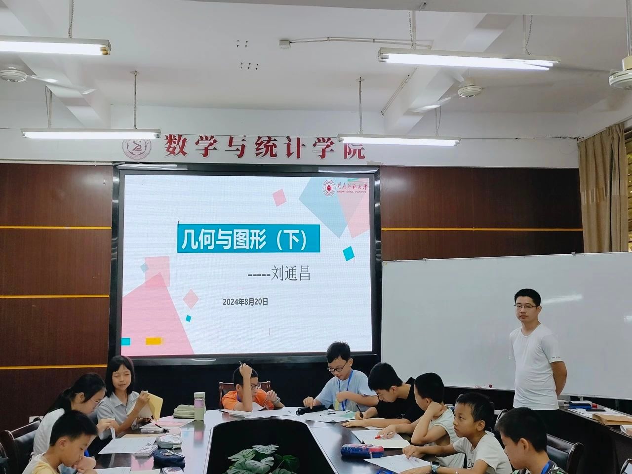 20日下午,由刘通昌老师讲解《图形与几何(下)》的课程,通过梯形、平行四边形等图形的引入,介绍倒序相加法,并初步介绍数列概念,进一步加深学生对找规律等题的理解。