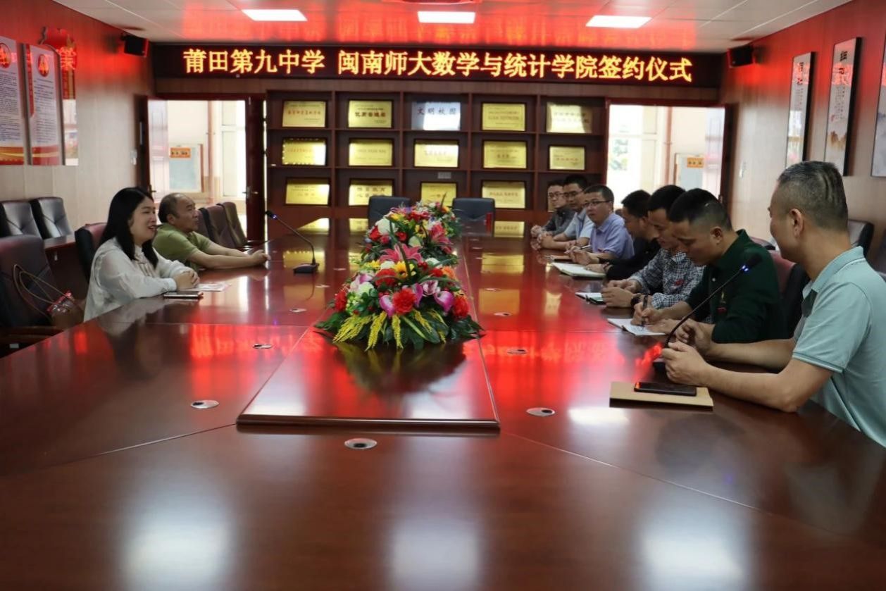2024年4月24日下午,我院副院长周仕荣教授与数学系系主任黄菊副教授代表学院,前往莆田市第九中学,共同举办实习教育签约仪式。莆田市第九中学朱国忠校长、陈山副校长、徐的义副校长、张弦副校长,以及办公室主任李希雄、教研室主任吕炜、教务处负责人郑建彬等校领导出席了本次签约仪式。双方代表在友好、热烈的氛围中进行了深入的交流,并就实习教育的合作内容、方式及未来发展前景进行了深入探讨。