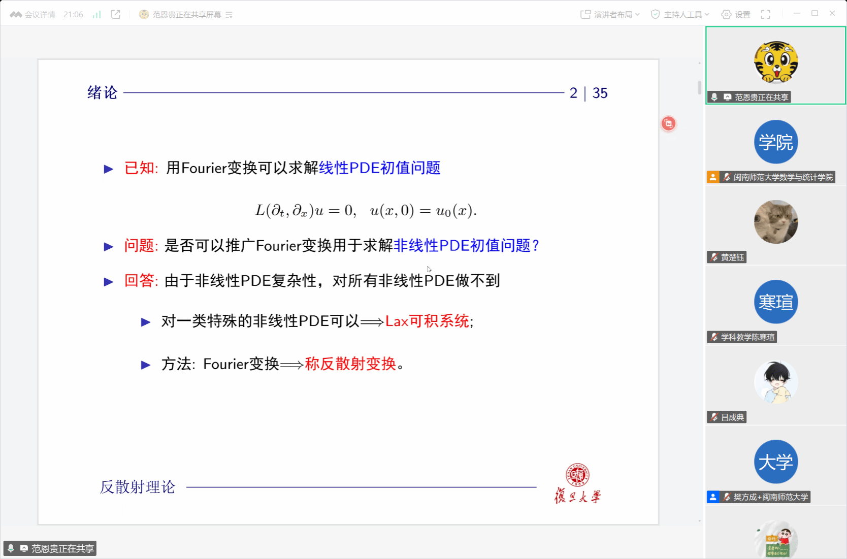 范恩贵是复旦大学教授、博士生导师,上海市曙光学者。范恩贵教授的主要研究方向是孤立子理论、可积系统、Riemann-Hilbert问题、正交多项式和随机矩阵理论。教授不仅主持国家自然科学基金,还主持了上海曙光计划等多项研究课题。在《Adv. Math. 》、 《Comm. Math. Phys.》、《SIAM J. Math. Anal.》、《J. Diff. Equ.》等国际重要期刊,范教授发表论文100余篇,同时应邀访问美国密苏里大学、日本京都大学等。范教授曾获教育部自然科学二等奖、上海市自然科学二等奖、复旦大学谷超豪数学奖。