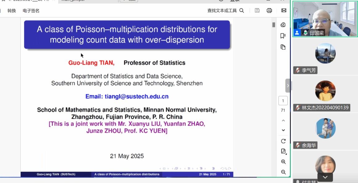应我院邀请,5月21日下午,南方科技大学田国梁教授在腾讯会议分别作了题为《A class of Poisson--multiplication distributions for modeling count data with over-dispersion(I)》和题为《A class of Poisson--multiplication distributions for modeling count data with over-dispersion(Ⅱ)》的两场讲座。相关师生聆听了此次讲座,讲座由施建华老师主持。