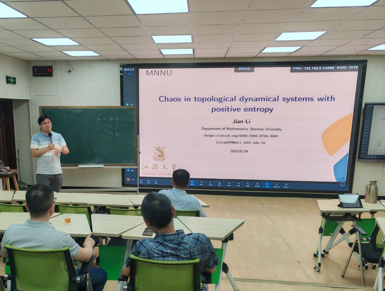 应我院邀请,5月24日下午,汕头大学数学科学学院李健教授在砺志楼131作了题为《Chaos in topological dynamical systems with positive entropy》的报告。学院相关方向的教师和研究生参加了此次讲座,讲座由唐忠宝老师主持。