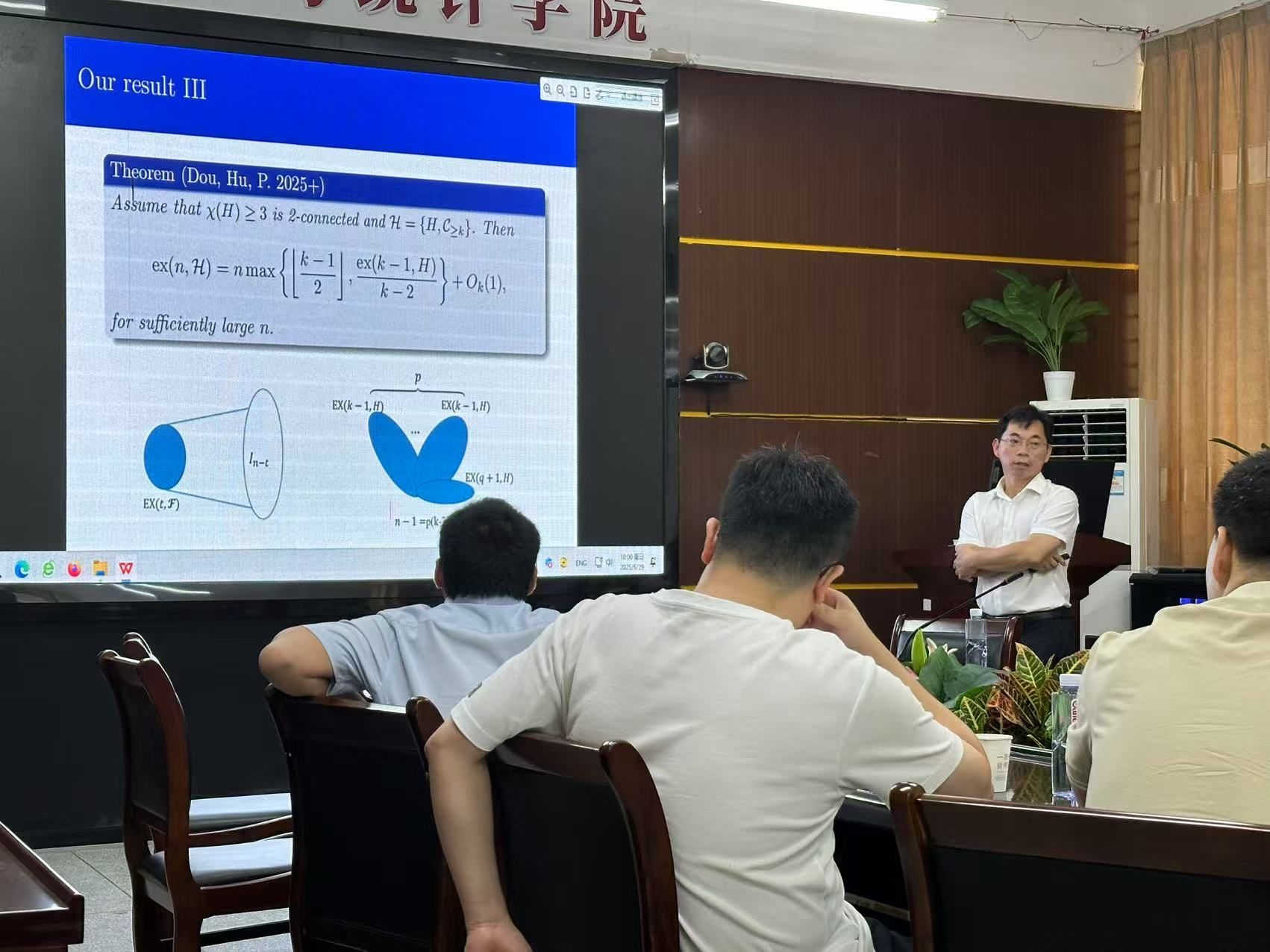应我院邀请,6月29日早上,安徽大学彭兴教授在砺志楼114作了题为《Turan number of cliques plus cycles and related problems》的讲座。相关师生聆听了此次讲座,讲座由卢福良老师主持。