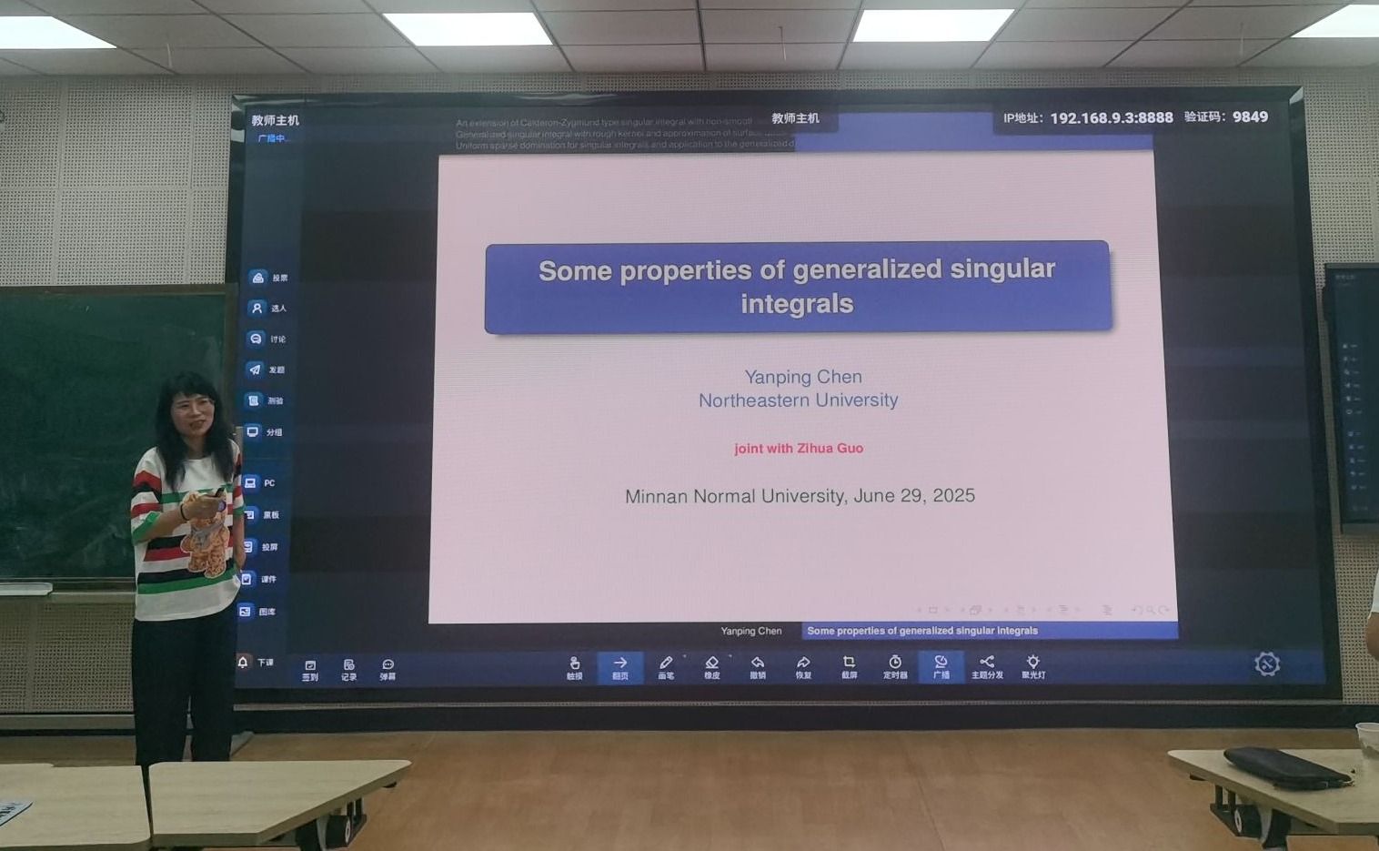 应我院邀请,6月29日早上,东北大学陈艳萍教授在砺志楼131作了题为《Some properties of generalized singular integrals》的讲座。相关师生聆听了此次讲座,讲座由温泳铭老师主持。