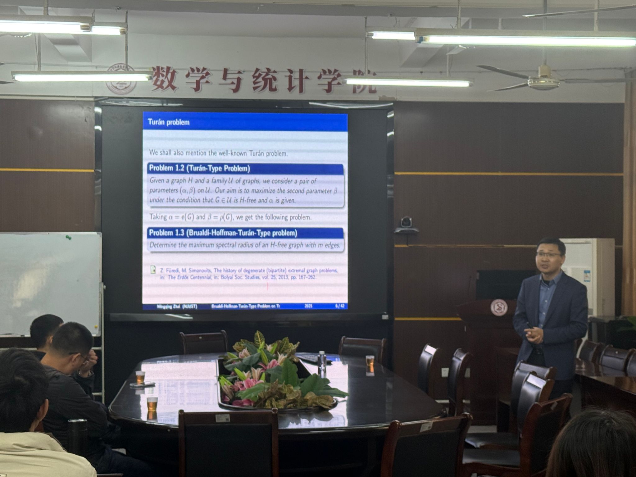 在讲座中,翟明清教授首先指出Brualdi-Hoffman-Turán型问题是谱图理论中的核心研究方向之一,对揭示图结构与谱性质的内在关联具有重要意义。在讲解的过程中,翟教授系统介绍了该问题的研究背景与核心内涵,重点阐述了三角形、四边形相关的系列经典研究成果,清晰梳理了问题的解决思路与技术方法。同时,翟教授聚焦领域前沿,分享了该方向的最新研究突破,为在场研究者呈现了学科发展的新动态与新趋势。此次讲座不仅深化了与会者对该经典问题的理解,更为谱图理论相关研究提供了新思路与新视角,对推动该领域学术研究的进一步发展具有积极的促进作用。