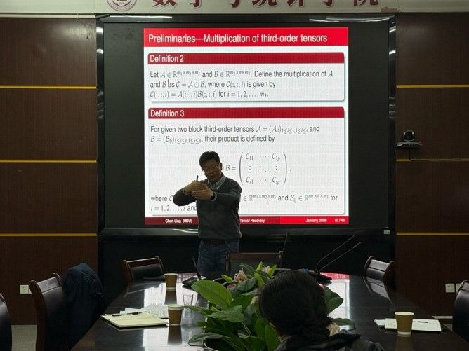 应我院邀请,1月25日下午,杭州电子科技大学凌晨教授在砺志楼114作了题为《A metric function for dual quaternion matrices and related least-squares problems》和《Robust tensor recovery via a nonconvex approach with ket augmentation and auto-weighted strategy》的两场讲座。相关师生聆听了此次讲座,讲座由凌永辉老师主持。
