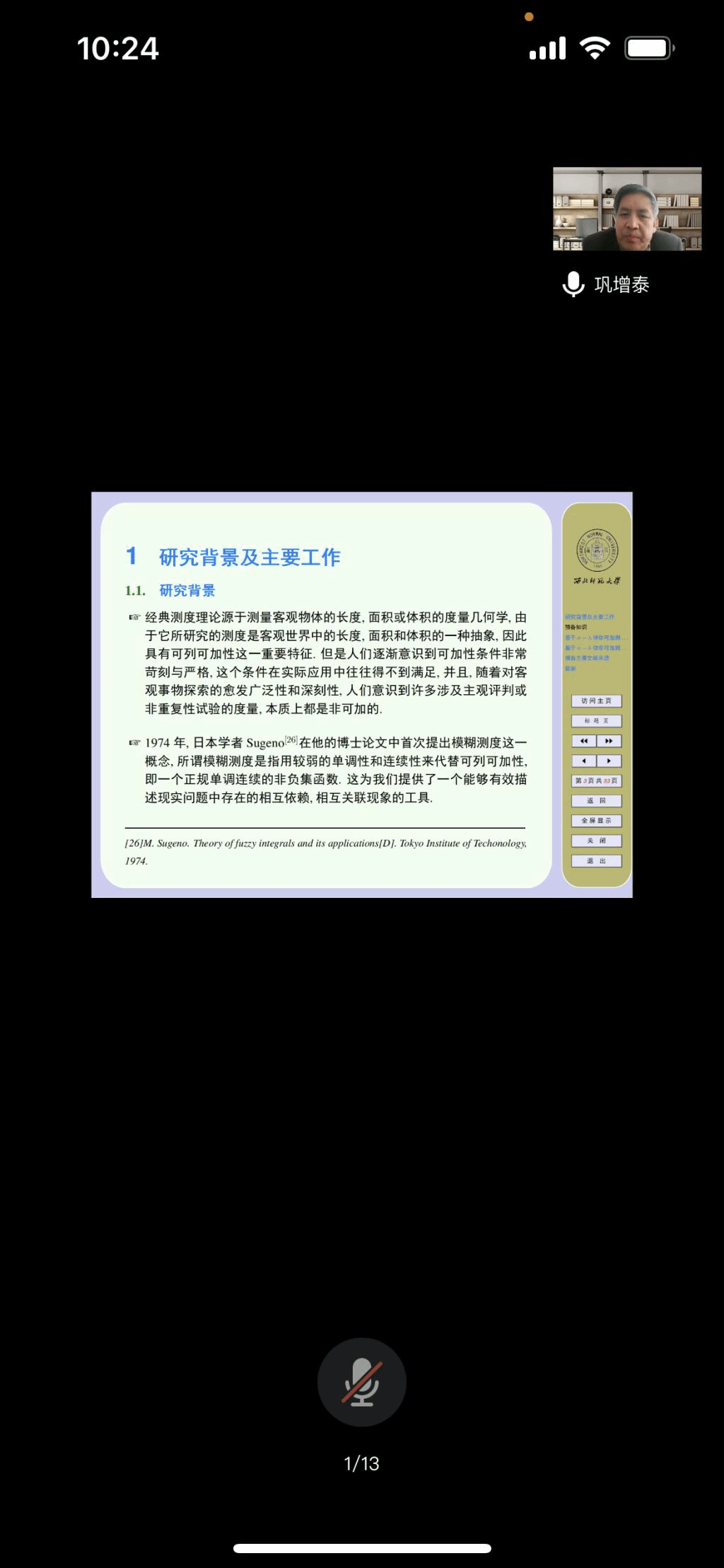 应我院邀请,5月1日早上,西北师范大学巩增泰教授在腾讯会议作了题为《基于sigma-lambda律非可加测度的OWA算子递归集成及其集成器设计》的报告。相关师生聆听了此次报告,报告由李进金老师主持。
