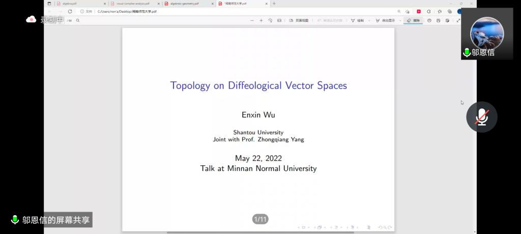 应我院邀请,5月22日早上,汕头大学邬恩信副教授在腾讯会议作了题为《Topology on diffeological vector spaces(广义向量空间上的拓扑)》的报告。相关师生聆听了此次报告,报告由杨忠强老师主持。