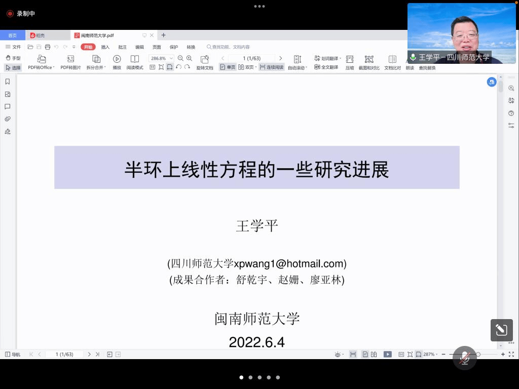 应我院邀请,6月4日上午,四川师范大学王学平教授在腾讯会议作了题为《半环上线性方程的一些研究进展》的报告。相关师生聆听了此次报告,报告由黄韩亮老师主持。
