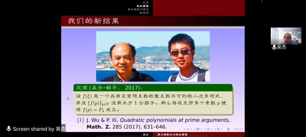 应我院邀请,8月4日早上,法国国家科学研究中心(CNRS)特级研究员吴杰在腾讯会议作了题为《算术指数对与欧拉猜想》的报告。相关师生聆听了此次报告,报告由曹炜老师主持。