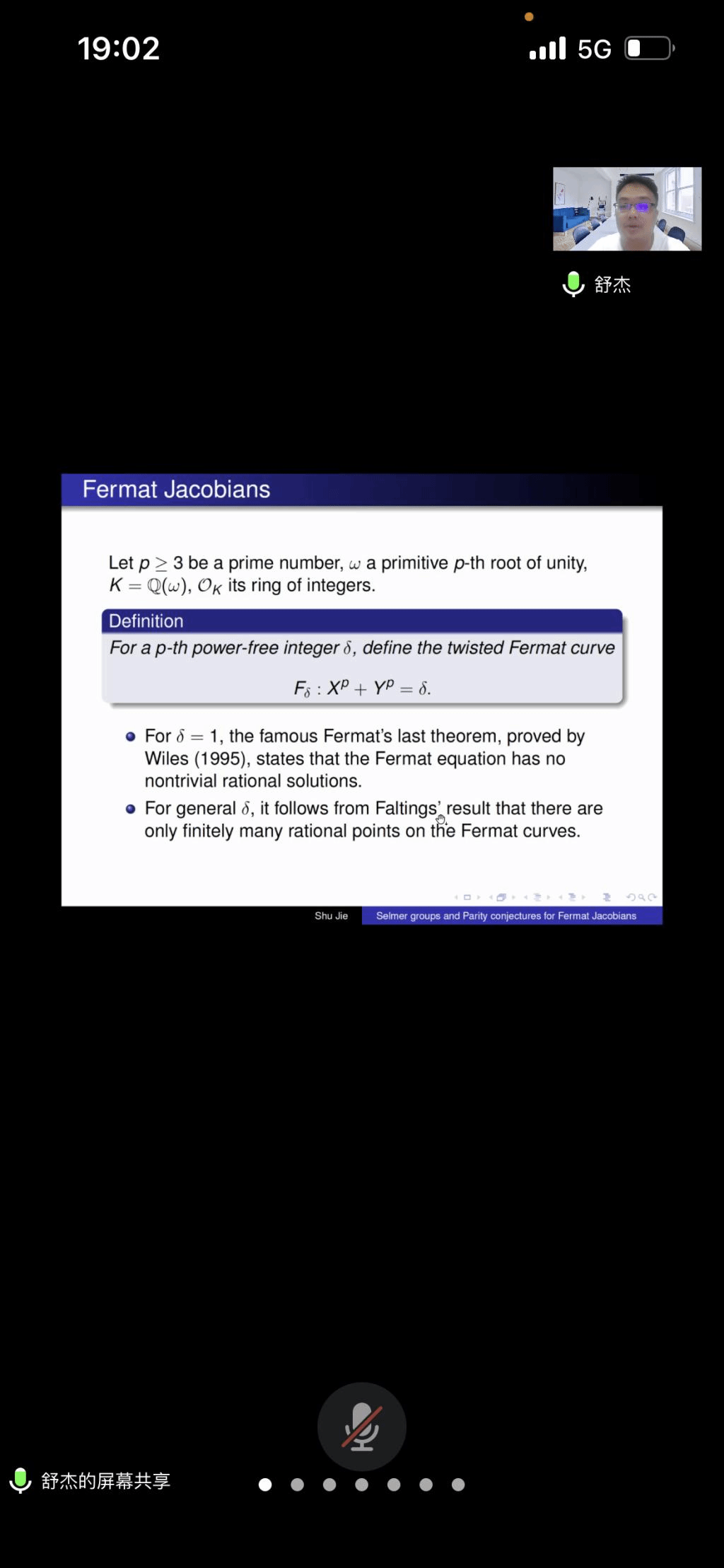 应我院邀请,8月31日晚上,同济大学舒杰副教授在腾讯会议作了题为《Selmer groups and parity conjectures for Fermat Jacobians》的报告。相关师生聆听了此次报告,报告由曹炜老师主持。