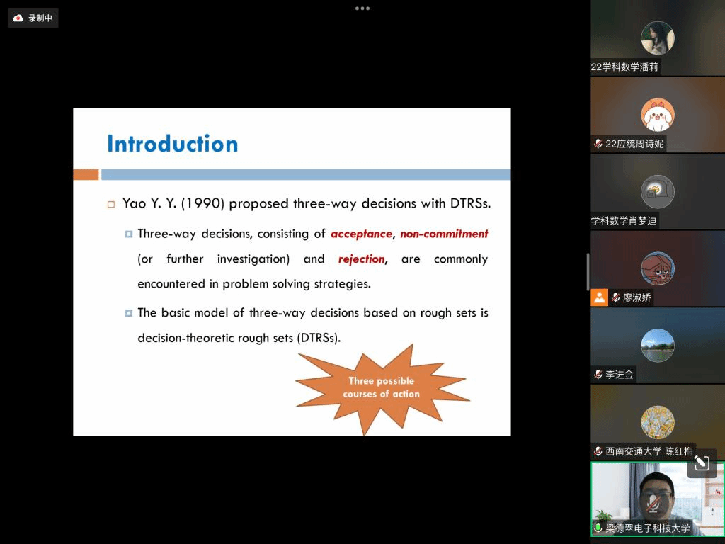 应我院邀请,10月18日下午,电子科技大学梁德翠教授在腾讯会议作了题为《三支决策中的偏好学习与共识机制研究》的报告。相关师生聆听了此次报告,报告由廖淑娇老师主持。