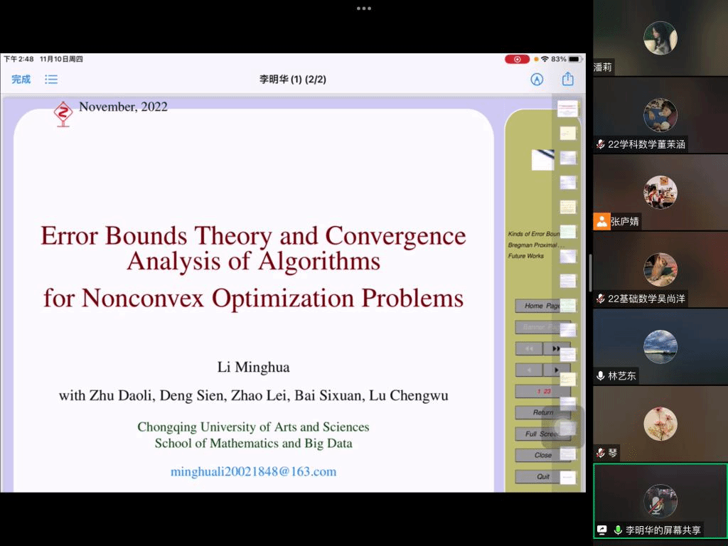 应我院邀请,11月10日下午,重庆文理学院李明华副教授在腾讯会议作了题为《非凸函数的误差界理论及在下降算法收敛率中的应用》的报告。相关师生聆听了此次报告,报告由林艺东老师主持。