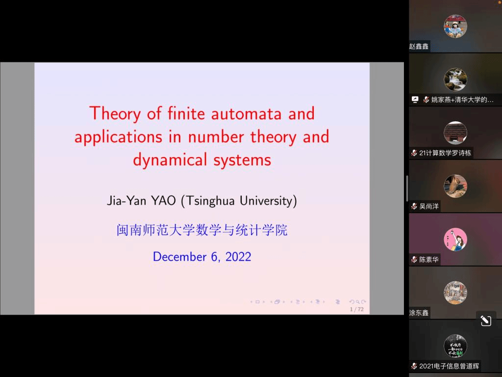 应我院邀请,12月6日下午,清华大学姚家燕教授在腾讯会议作了题为《有限自动机理论及其在数论与动力系统中应用》的报告。相关师生聆听了此次报告,报告由曹炜老师主持。