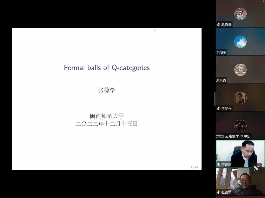 应我院邀请,12月15日下午,四川大学张德学教授在腾讯会议作了题为《Formal balls of Q-categories》的报告。相关师生聆听了此次报告,报告由唐忠宝老师主持。