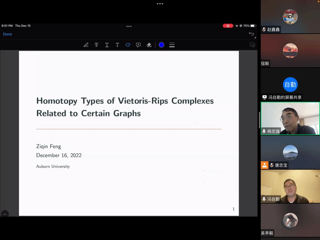 应我院邀请,12月16日上午,美国奥本大学冯自勤副教授在腾讯会议作了题为《Homotopy Types of Vietoris-Rips Complexes Related to Certain Graphs》的报告。相关师生聆听了此次报告,报告由唐忠宝老师主持。