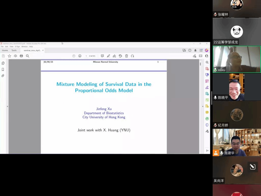 应我院邀请,4月15日及16日下午,香港城市大学徐锦峰研究员在腾讯会议作了题为《A Mixture Modelling Approach for Complex Survival Data》的序列报告。相关师生聆听了此次报告,报告由施建华老师主持。