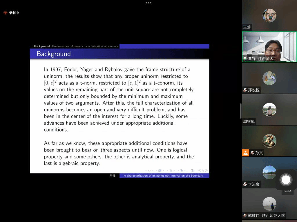 应我院邀请,4月21日下午,江西师范大学覃锋教授在腾讯会议作了题为《Some advances in a uninorm with continuous underlying operators》的报告。相关师生聆听了此次报告,报告由孙文老师主持。