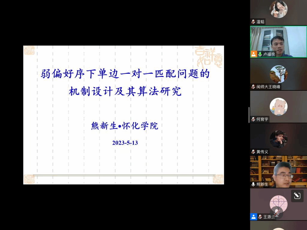 应我院邀请,5月13日晚上,怀化学院熊新生副教授在腾讯会议作了题为《弱偏好序下单边一对一匹配问题的机制及其相应算法设计》的报告。相关师生聆听了此次报告,报告由卢福良老师主持。