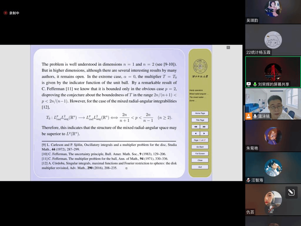 报告中,刘荣辉博士介绍了Hardy型算子的混合径向角可积性,然后通过Hardy型的交换算子给出了混合径向角λ-中心有界平均振荡空间和中心Campanato空间的一些性质。报告结束后,在座的师生就相关研究问题进行了探讨和交流。