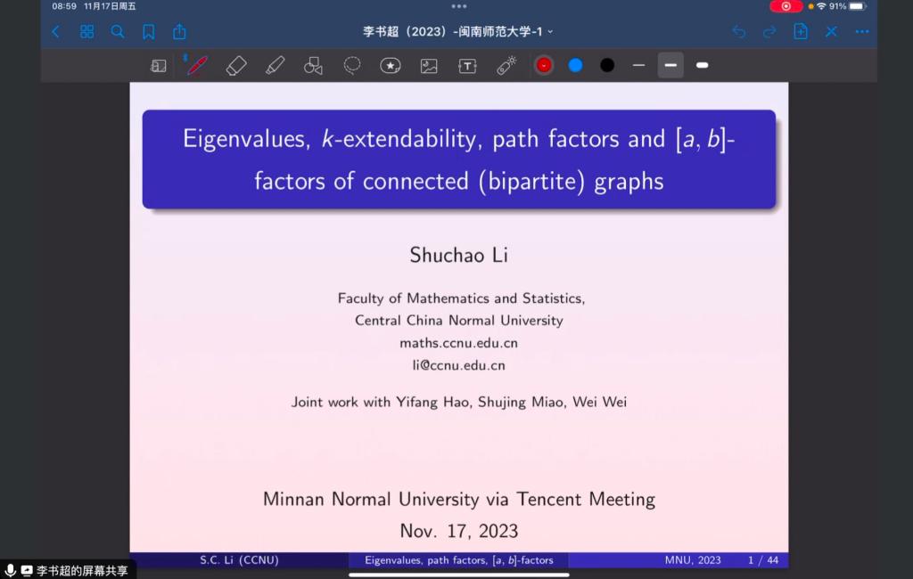 应我院邀请,11月17日上午,华中师范大学李书超教授在腾讯会议作了题为《图因子存在性的谱刻画及其相关问题研究》的报告。相关师生聆听了此次报告,报告由卢福良老师主持。